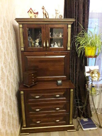 Бюро из натурального дерева , массив сосны , цвет красно-коричневый 3 декорирован золотой патиной , мебель выполнена по индивидуальному проекту.